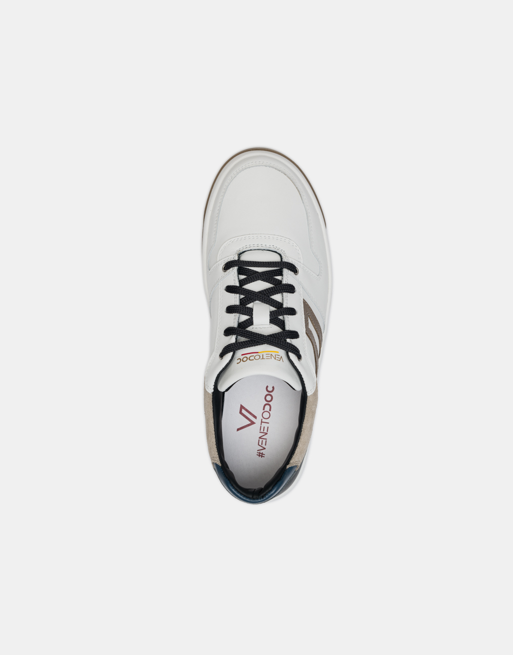 Scarpa realizzata 100% in veneto con materie prime di aziende venete. Tomaia in pelle e crosta, con materiali sostenibili, chrome free. Fodera in pelle. Laccio in cotone. Suola in gomma